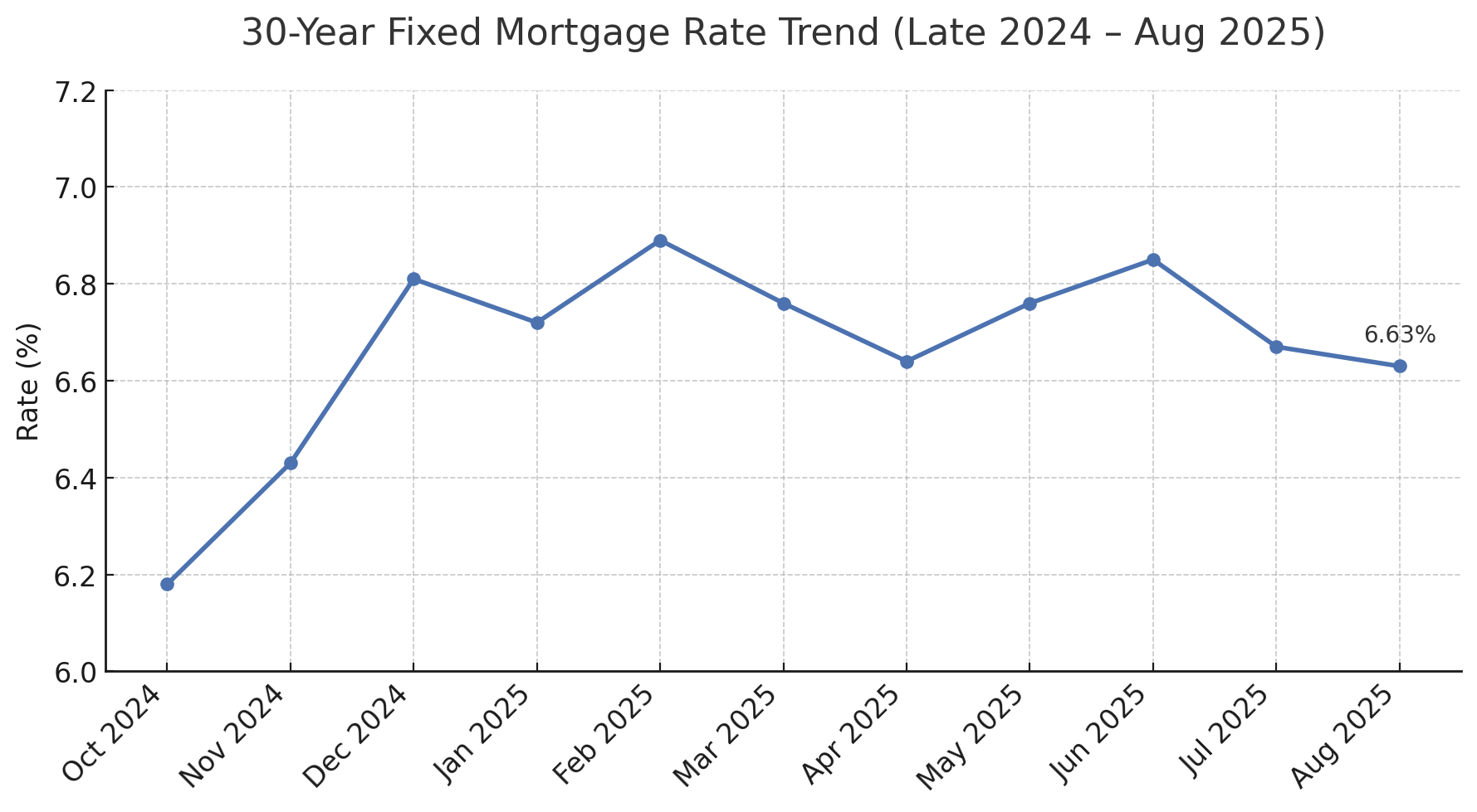 30-Year Fixed (Freddie Mac, ~Aug 1, 2025): ~6.63%