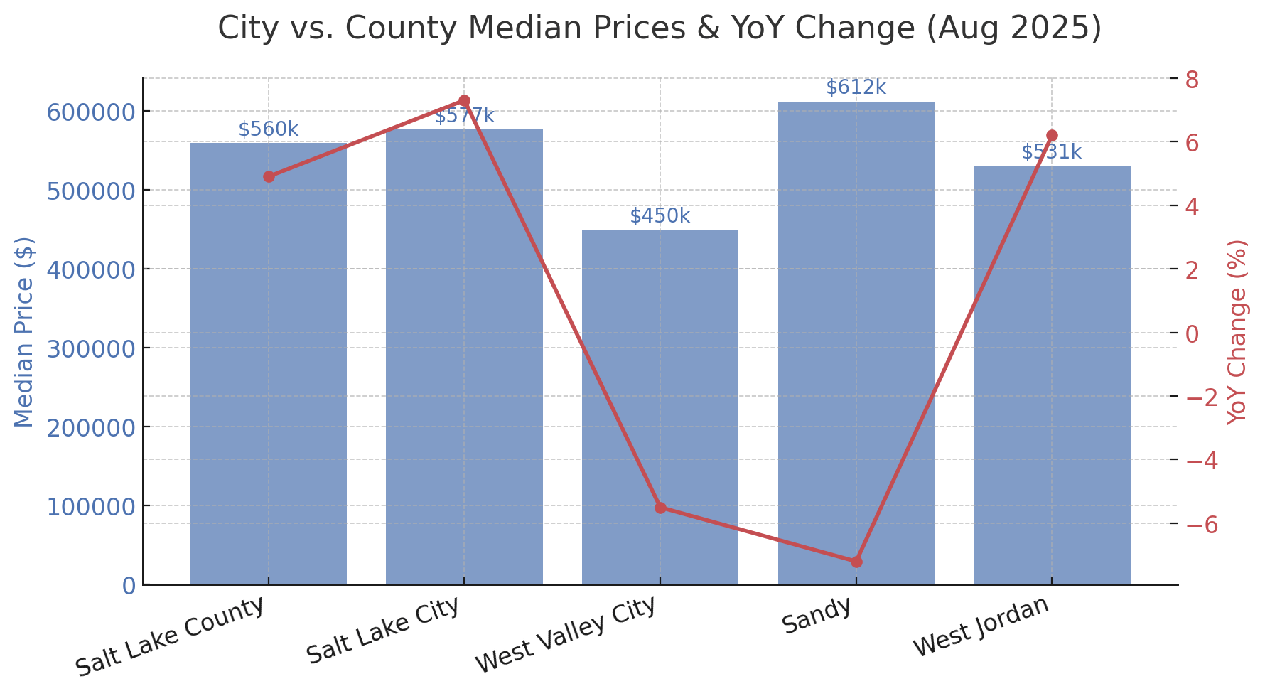 Quick read: Mixed pricing across the county; SLC proper and West Jordan are up YoY, while Sandy and West Valley are softer—classic “micro-market” behavior.