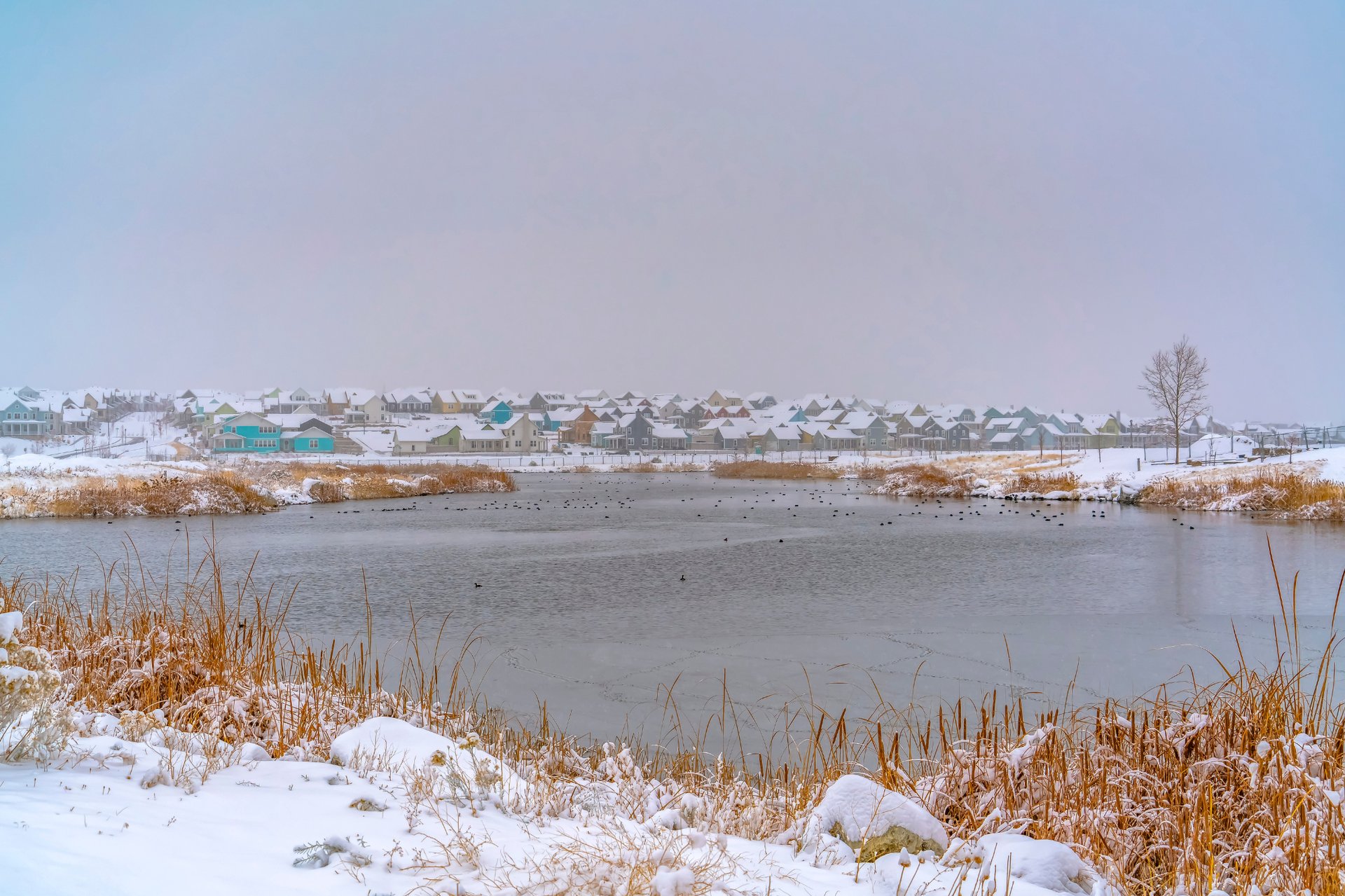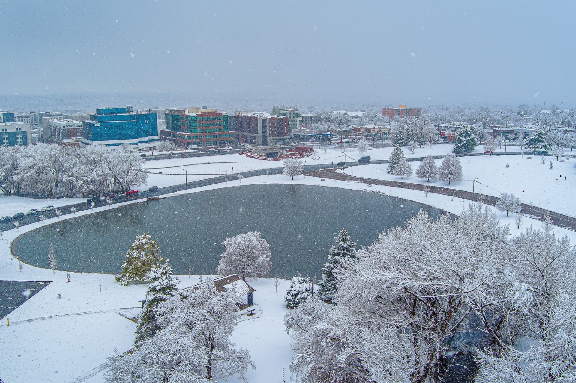 A classic neighborhood park with walking paths, ponds, and open space — snow or not.